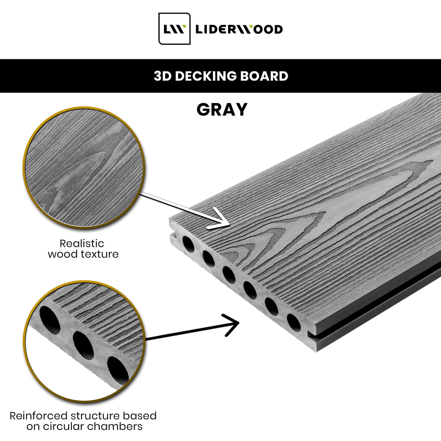The 3D board combines an elegant look with a practical approach to Terrace/Deck design. Thanks to its double-sided finish, you can match the appearance to your preferences—choosing between natural embossing and subtle grooving. The reinforced structure and high-quality composite make the board resistant to moisture, rot, UV radiation, and insects.