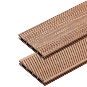 This double-sided decking board offers the beauty of natural shades: oak and walnut. Premium boards can be laid on either side – the second color remains hidden. Like the other Premium boards and Solid boards, its natural look is also enhanced by the characteristic wood grain pattern. They also have a polymer coating on all sides, protecting them from stains, color loss, and abrasion.