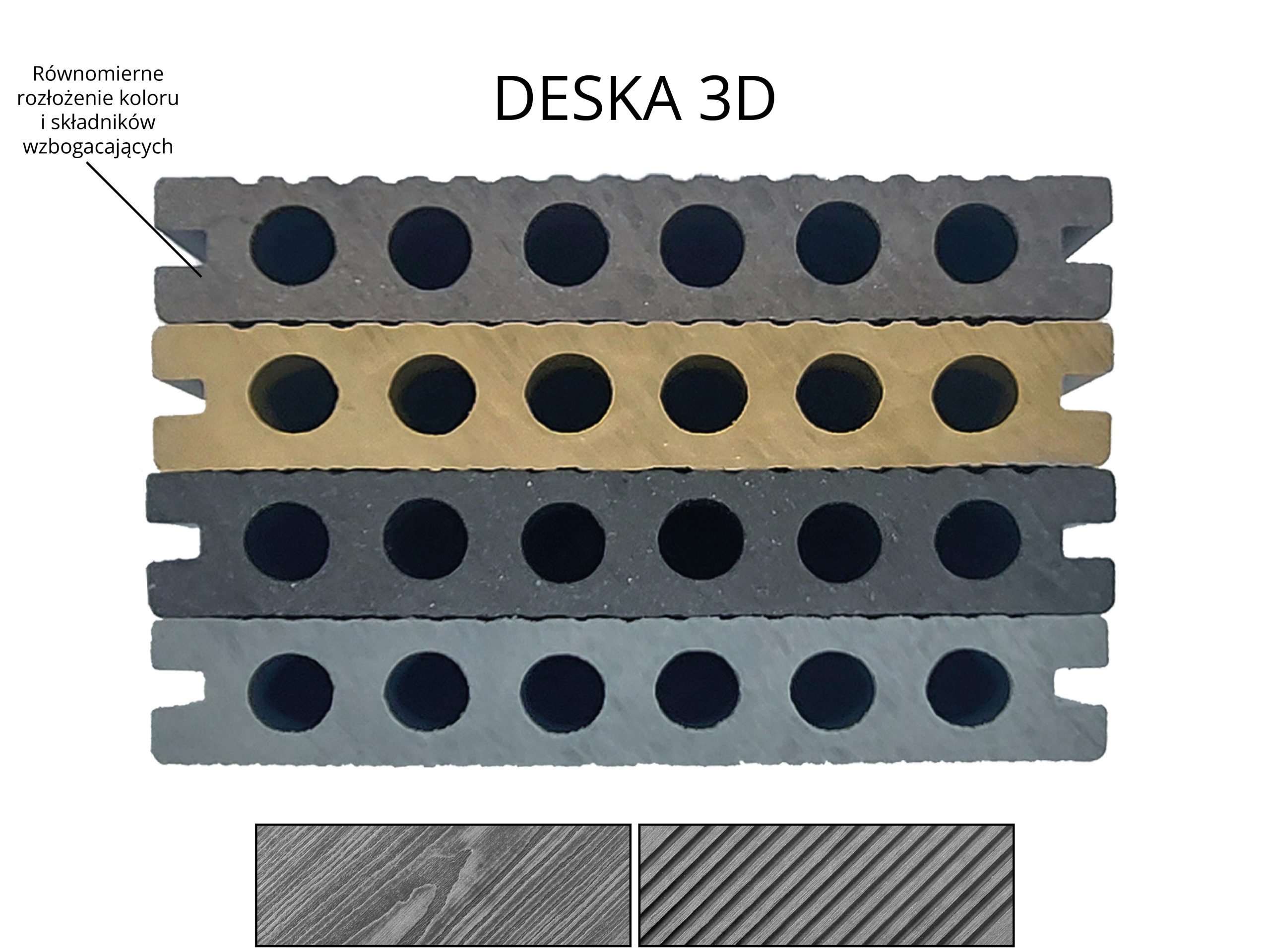 Cross-Section of 3D Decking Board: Brown, Honey Teak, Anthracite, Gray