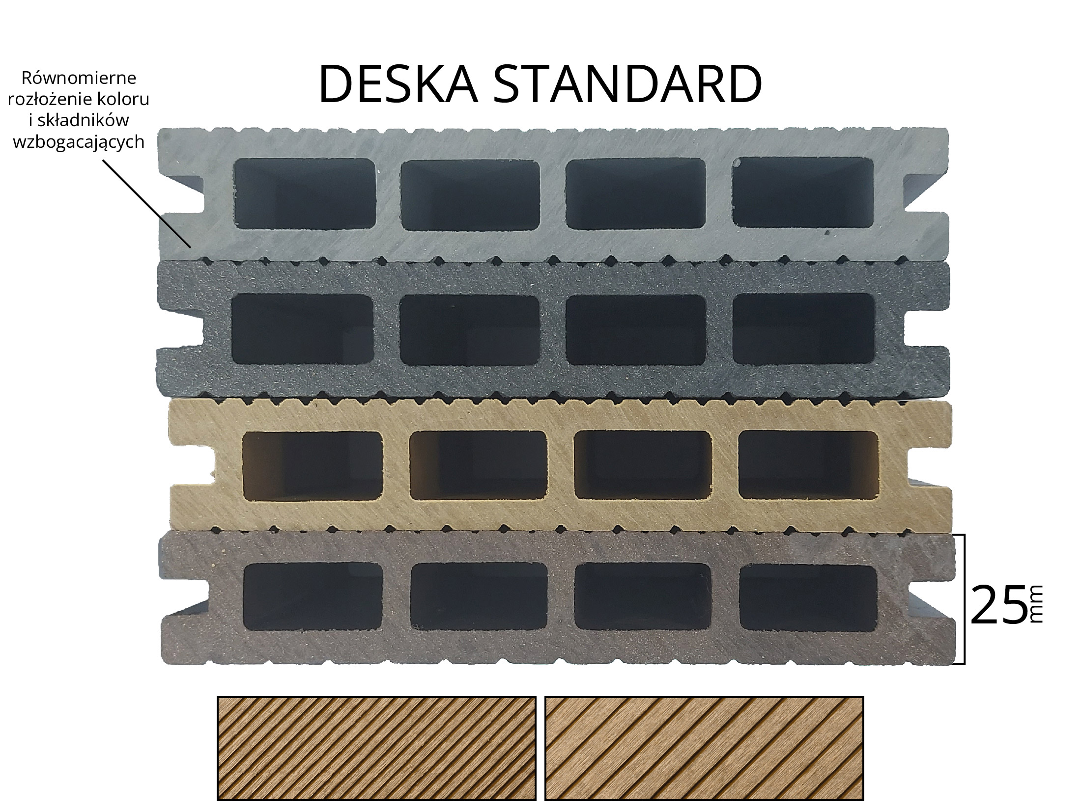 Smooth decking boards are available on the market, but unlike grooved or wood-grain patterned boards, they do not provide slip resistance. All decking boards in our range are double-sided. The Standard boards have both fine and wide grooves, while the 3D boards feature a wood-grain pattern and grooves. The Premium boards, on the other hand, are dual-colored and feature only a wood-grain pattern.