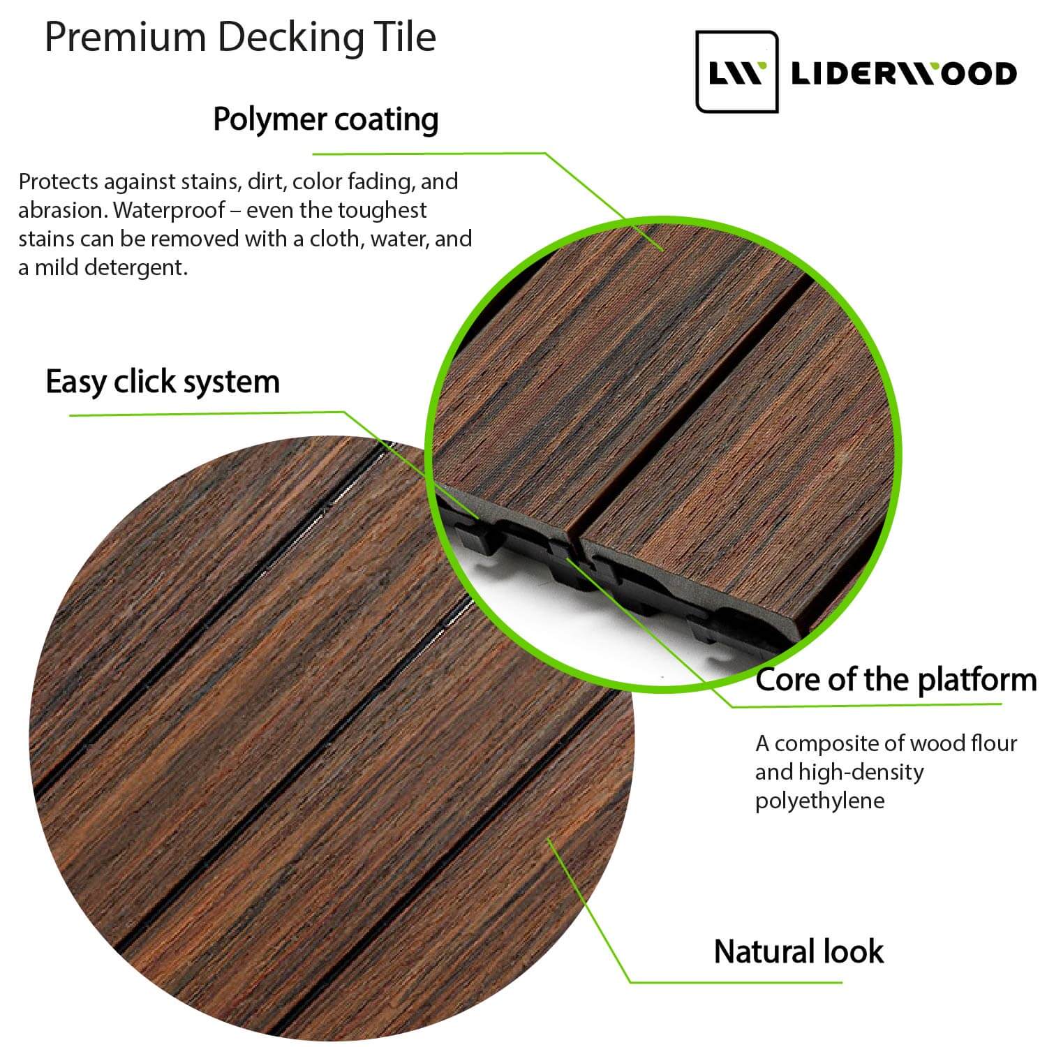 The Premium Composite Deck Tile combines outstanding quality with a classic style. It features a natural wood-like appearance, delivering an elegant and long-lasting effect for years to come. Additionally, it is easy to install, allowing you to quickly and conveniently create an attractive outdoor space.
