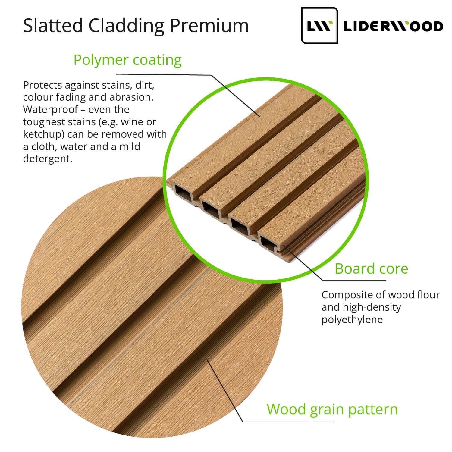 The slats are made from a durable composite of wood flour and high-density polyethylene (HDPE). Their surface is protected with a polymer coating—a layer that helps guard against abrasion, stains, and moisture. The panels are easy to clean and require no maintenance or oiling.