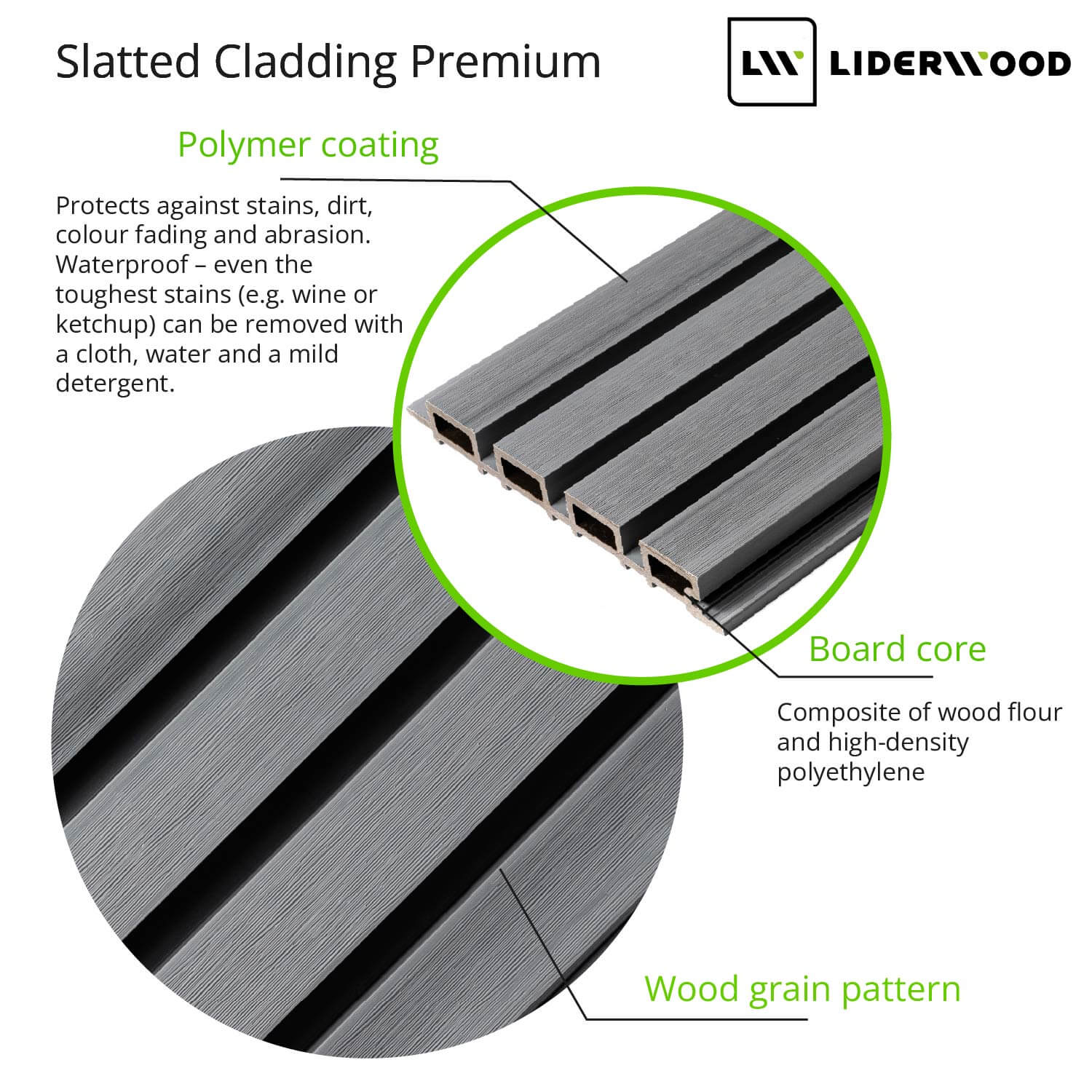 The slats are made from a durable composite of wood flour and high-density polyethylene (HDPE). Their surface is protected with a polymer coating—a layer that helps guard against abrasion, stains, and moisture. The panels are easy to clean and require no maintenance or oiling.