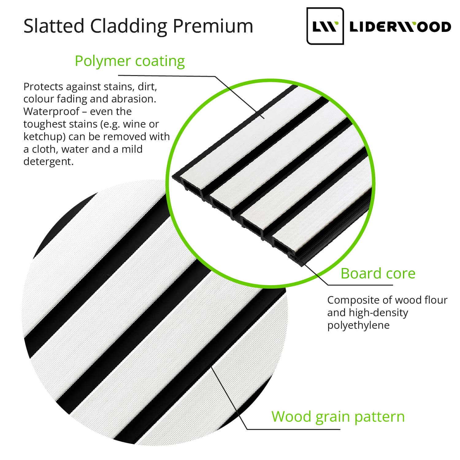 The slats are made from a durable composite of wood flour and high-density polyethylene (HDPE). Their surface is protected with a polymer coating—a layer that helps guard against abrasion, stains, and moisture. The panels are easy to clean and require no maintenance or oiling.