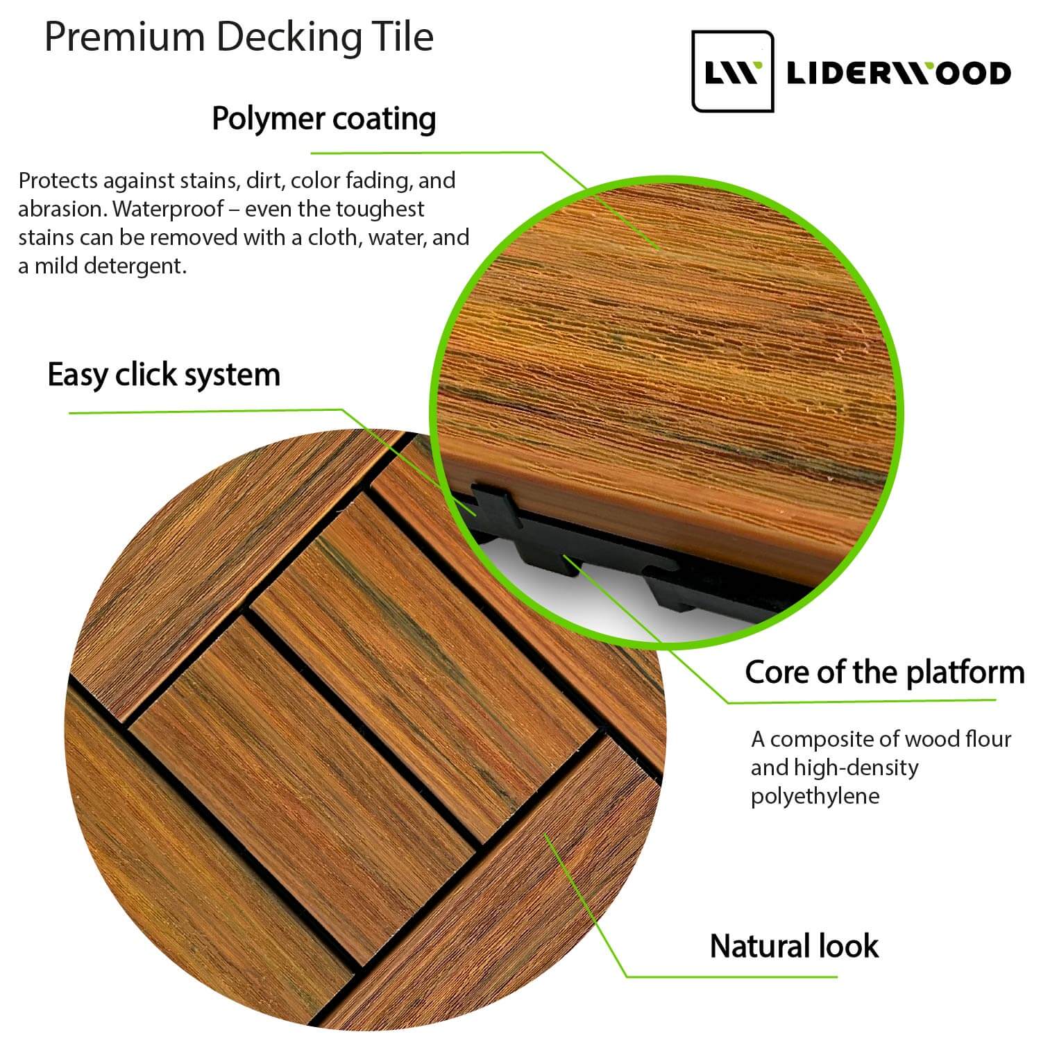 The Premium Composite Deck Tile combines outstanding quality with a classic style. It features a natural wood-like appearance, delivering an elegant and long-lasting effect for years to come. Additionally, it is easy to install, allowing you to quickly and conveniently create an attractive outdoor space.