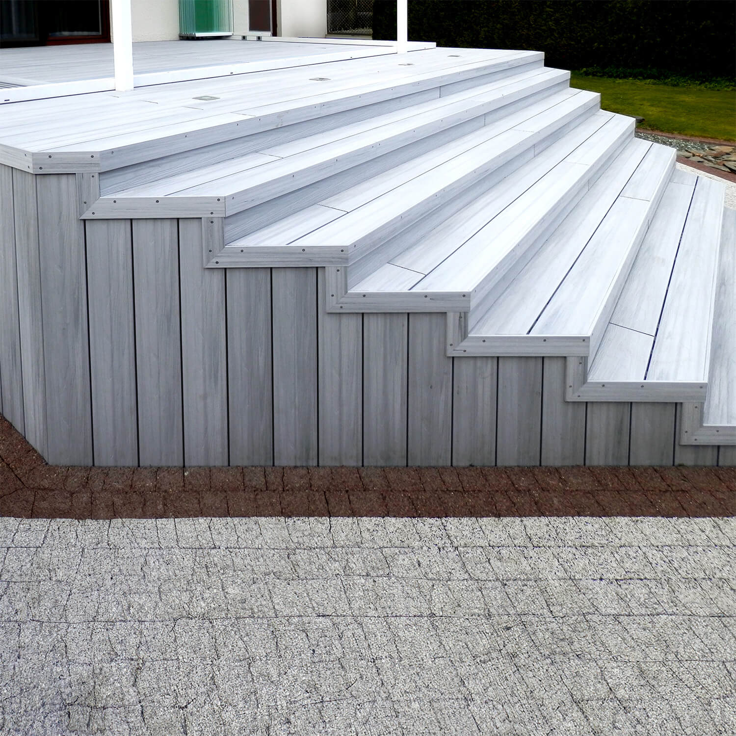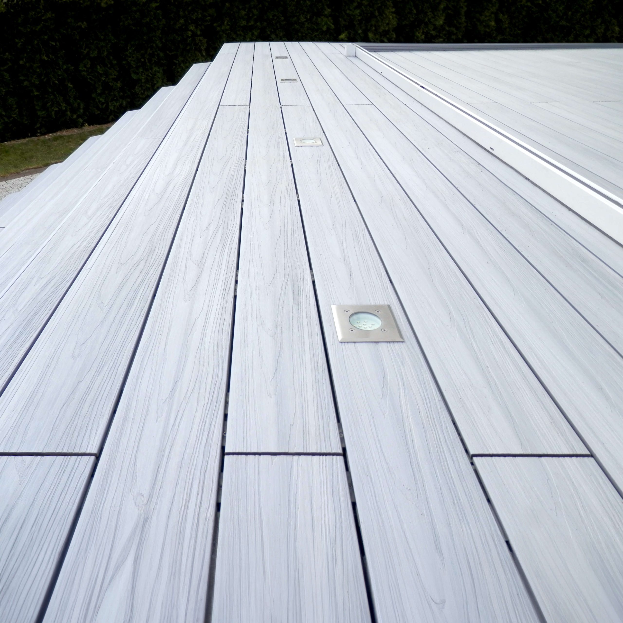 This terrace is built with Solid Light Grey composite decking, whose subtle silver-grey finish and delicate grain bring a sense of lightness and freshness to the space. The wide, multi-level step layout resembles a modern stage, leading directly to a lounge area shaded by a glass pergola.